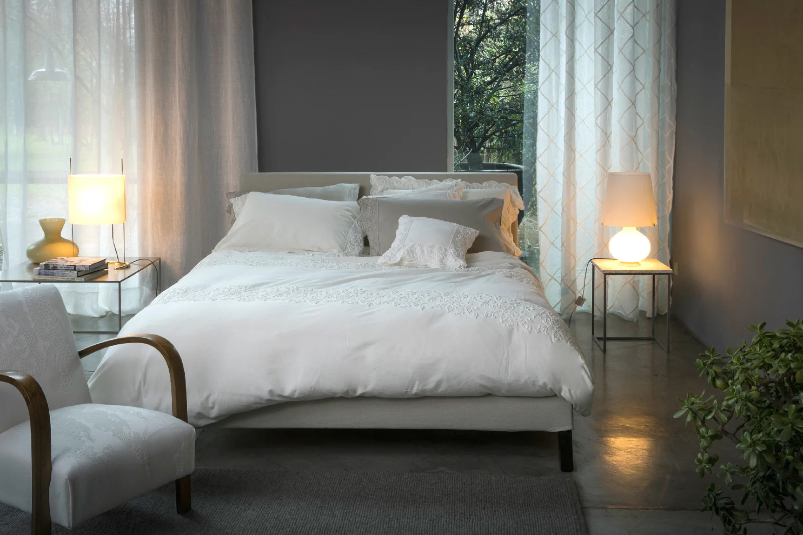 Dekbedovertrek set van katoensatijn met één strook borduursel. 2 geborduurde kussenslopen zonder volant(en) inclusief.
